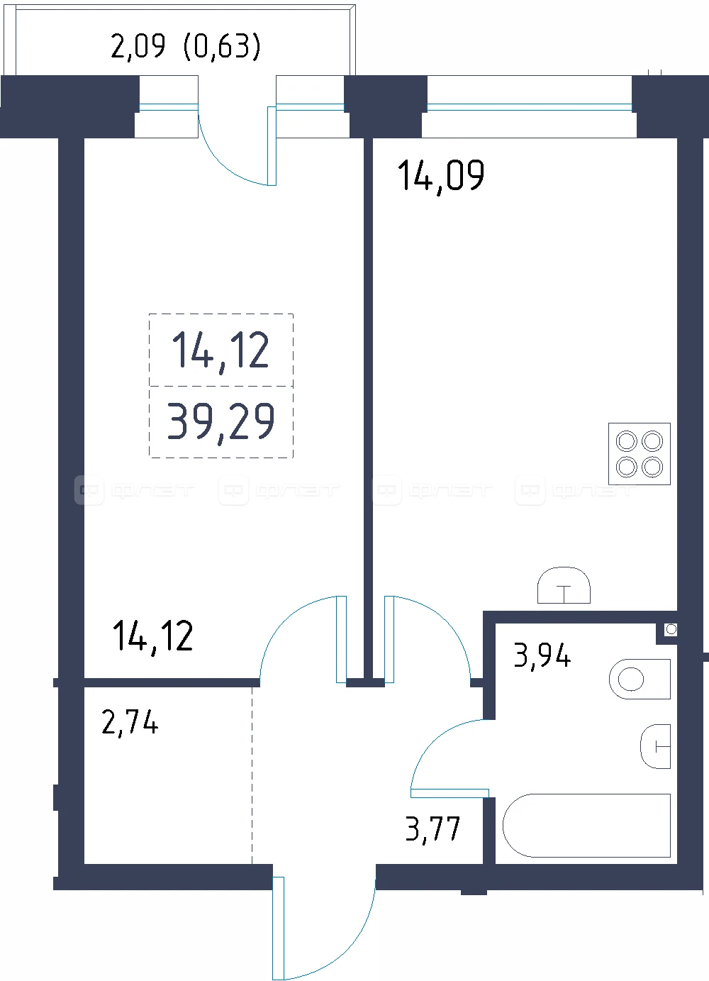 - 39.29/14.12/14.09 м²