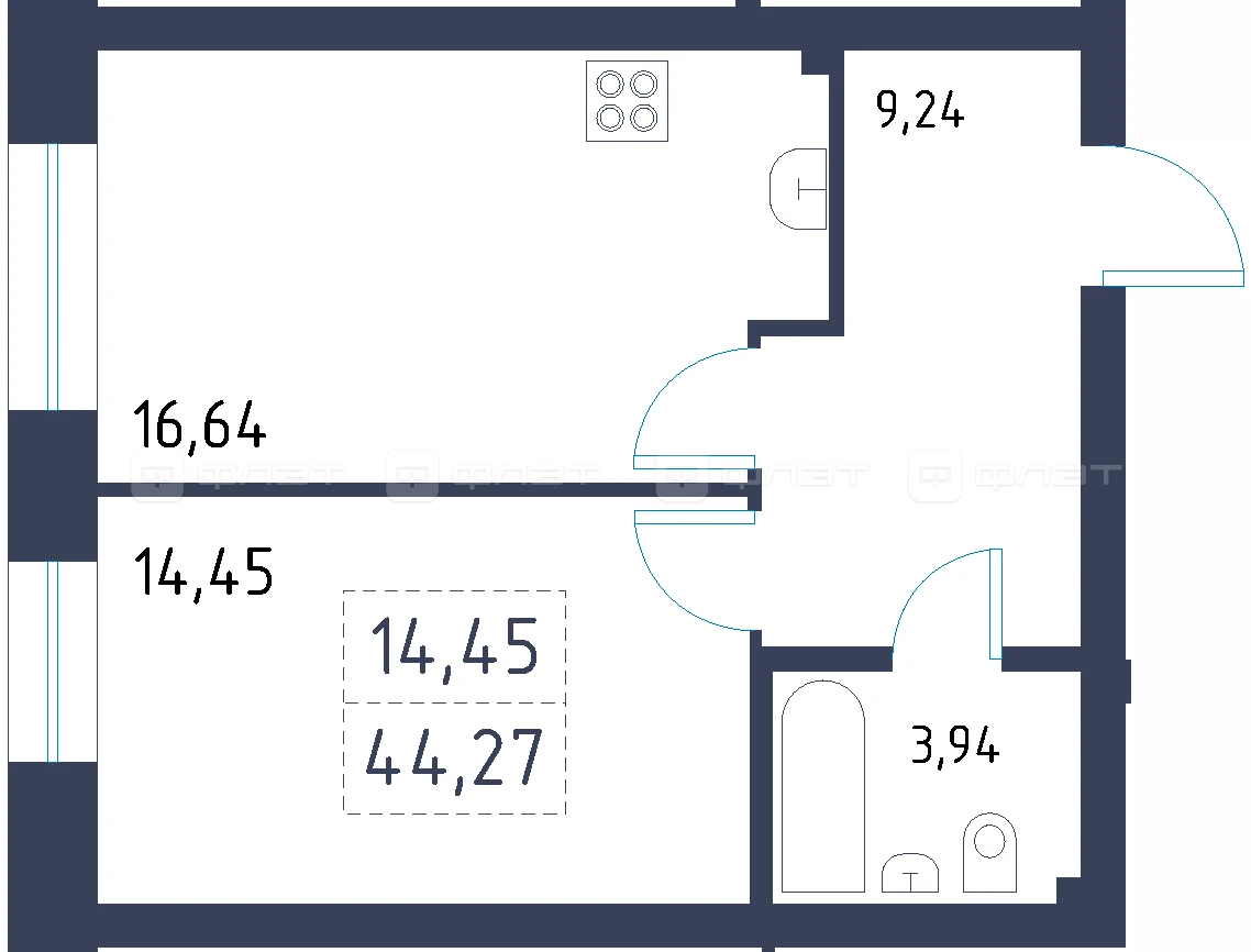 - 44.27/14.45/16.64 м²