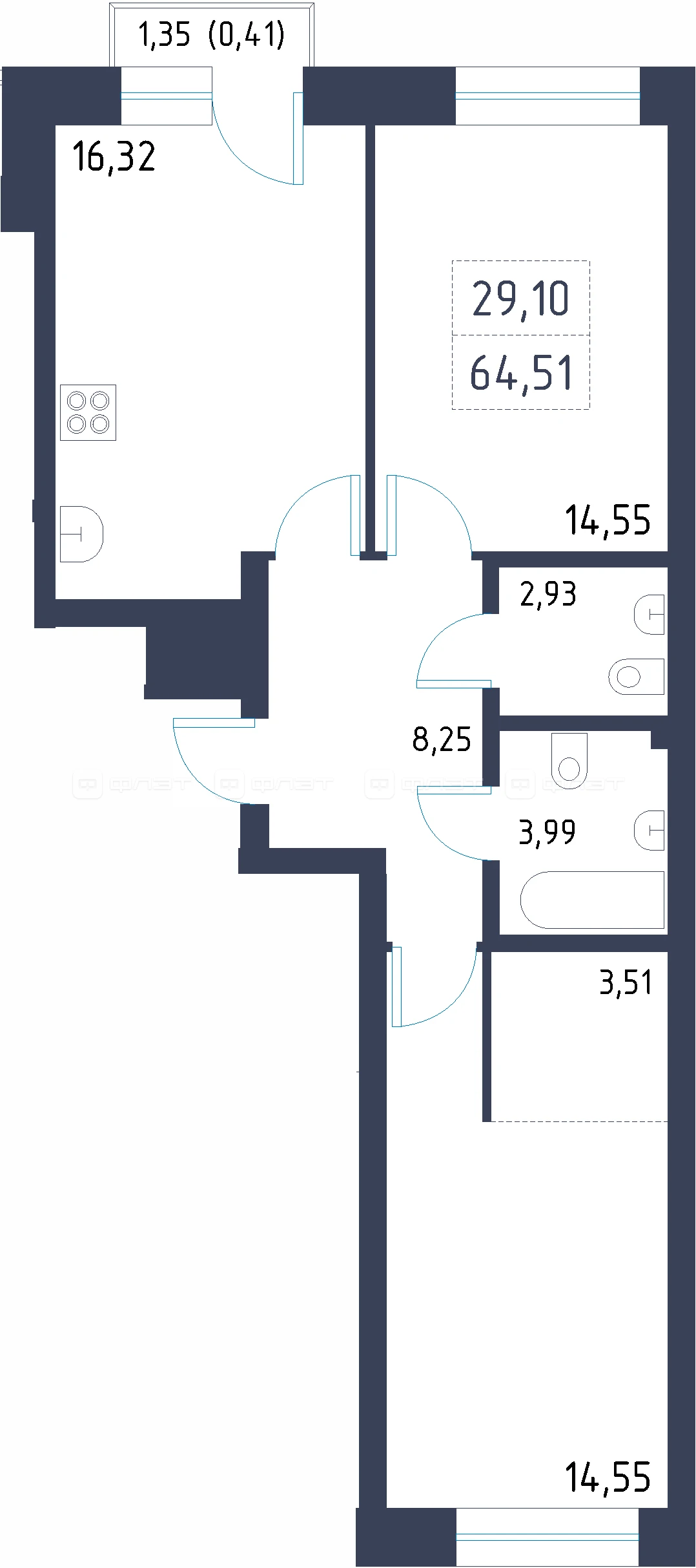 - 64.51/29.1/16.32 м²